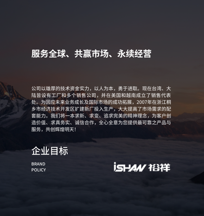 服務全球、共贏市場、永續經營 公司以雄厚的技術資金實力,以人為本,勇于進取?,F在臺灣、大陸皆設有工廠和多個銷售公司,并在美國和越南成立了銷售代表處。為因應未來業務成長及國際市場的成功拓展,2007年在浙江桐鄉市經濟技術開發區擴建新廠投入生產,大大提高了市場需求的配套能力。我們將一本求新、求變、追求完美的精神理念,為客戶創造價值、求真務實、誠信合作,全心全意為您提供最可靠之產品與服務,共創輝煌明天! 企業目標 BRAND POLICY